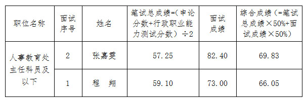 2017年我局计划招录人事教育处公务员1名。面试入围2人,实际参加面试2人。根据中央国家行政机关及其直属机构考试录用公务员面试工作实施细则,我局制定了公务员面试工作方案。在省公务员局的指导和监督下,2017年2月23日进行了公务员面试。现将综合成绩公告如下: