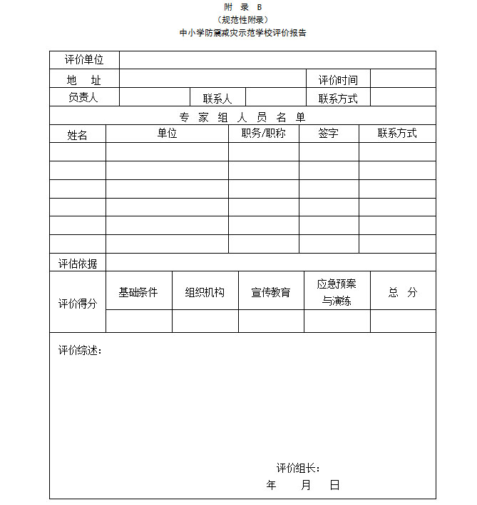 1 范围本标准规定了中小学防震减灾示范学校评价的术语和定义,要求和评价方法。本标准适用于中小学防震减灾示范学校的评价认定工作。2 规范性引用文件下列文件对于本文件的应用是必不可少的。凡是注日期的引用文件,仅所注日期的版本适用于本文件。凡是不注日期的引用文件,其最新版本(包括所有的修改单)适用于本文件。GB/T 18207 防震减灾术语DB J04-277 应急避难场所建设标准3 术语和定义GB/T 18207界定的以及下列术语和定义适用于本标准。3.1防震减灾示范学校学校在基础设施建设和日常的教学、科研、管理、服务过程中,严格遵守国家有关防震减灾方面的法律、法规、政策和标准要求,坚持传播防震减灾科学理念,培养教师、学生的防震减灾意识,采取积极有效的管理手段和技术措施,不断提高学校整体的防震减灾能力。4 要求4.1基础条件4.1.1.学校选址合理,应避开活断层、崩塌、滑坡、泥石流等地质灾害危险区。4.1.2.学校校内及周边应无易燃、易爆、腐蚀、放射性等可能引发严重地震次生灾害的危险源。4.1.3.学校建筑应符合抗震设防相关要求。4.1.4.学校整体规划合理,应具备紧急疏散和应急避险条件。4.1.5.学校应急疏散标志应符合DB J04-277要求。4.1.6.学校消防安全应符合国家相关标准要求。4.2组织机构4.2.1学校应成立防震减灾示范学校领导小组,分工明确,责任到位。4.2.2学校应制定防震减灾示范学校建设规划和年度工作计划。4.2.3学校每年应有防震减灾保障经费。4.2.4学校防震减灾工作应纳入学校考核机制。4.3宣传教育4.3.1学校应把防震减灾教育纳入教育教学活动。4.3.2教职工应具备一定的防震减灾知识,有专(兼)职人员负责防震减灾教育。4.3.3学校应有防震减灾宣传活动场所和设施设备。4.3.4学校应配备防震减灾宣传读物。4.3.5学校应在每年“5.12全国防灾减灾日”、“全国中小学生安全教育日”等重要时段,通过校园广播、网站、校刊、板报、新媒体等多种途径积极开展防震减灾宣传教育活动。4.3.6学校应采用多种活动形式(知识竞赛、模拟演练、课外兴趣小组、第二课堂等)对学生的防震减灾知识掌握情况进行考察。4.4应急预案与演练4.4.1学校应根据地震应急预案编制规定和要求,制定本校的地震应急预案,并适时修订与完善。4.4.2学校应每年至少组织两次地震应急演练。4.4.3学校师生应熟知地震应急预案内容及应急疏散路线,掌握地震应急避险知识和应急避险技能。4.4.4学校应每年至少开展一次地震安全隐患排查。5 评价方法5.1评价依据按照附录A要求进行。5.2评价报告按照附录B要求进行。5.3结果应用5.3.1总分85分(含)以上的评为山西省中小学防震减灾示范学校。5.3.2中小学防震减灾示范学校采取动态管理,年度评定的方式,经评价认定后的防震减灾示范学校有效时限为三年。