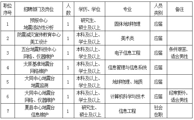 根据事业发展需要,经中国地震局批准,365备用网址安全化所属预报中心等6个单位2016年面向社会公开招聘7名工作人员。现将有关事项公告如下: 一、招聘计划